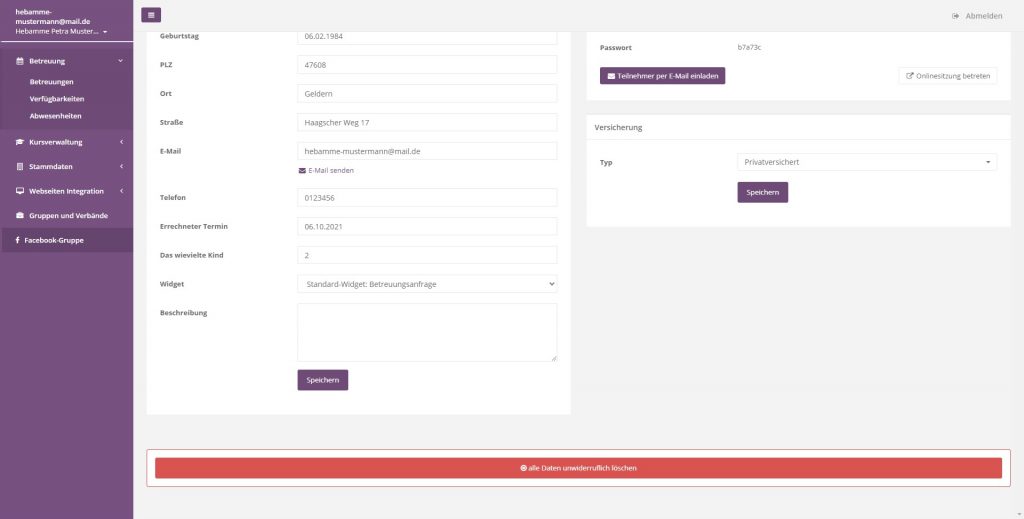Sobald Sie den Knopf gedrückt und die Abfrage bestätigt haben werden alle Daten der Schwangeren unwiderruflich gelöscht.