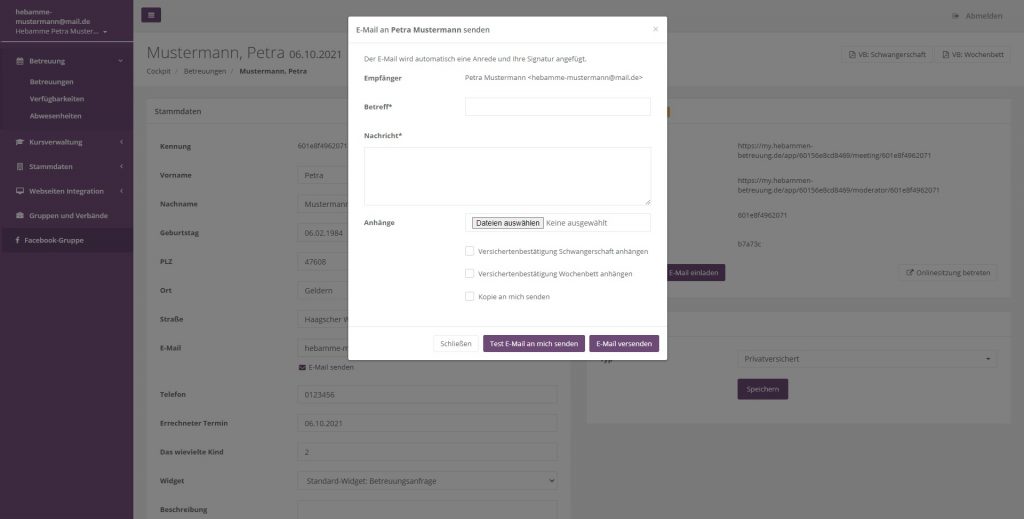 Im Stammdaten-Blatt unterhalb der E-Mail-Adresse können Sie eine E-Mail an die Betreute senden.