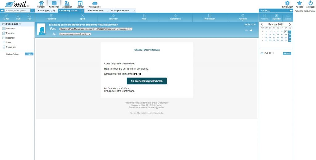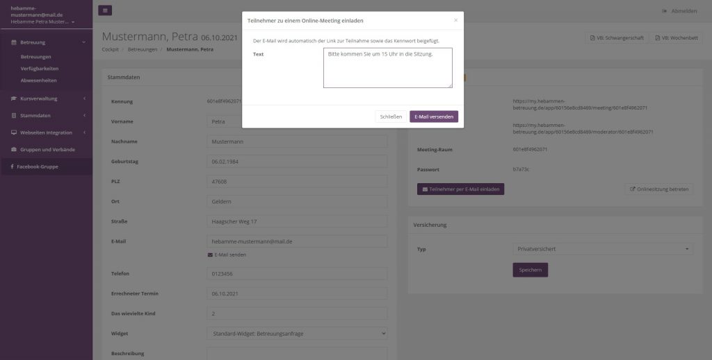 Im Stammdaten-Blatt der Betreuten können Sie die Sitzung betreten und die Betreute per E-Mail einladen. Auch hier wird der E-Mail automatisch eine Anrede und Signatur hinzugefügt.