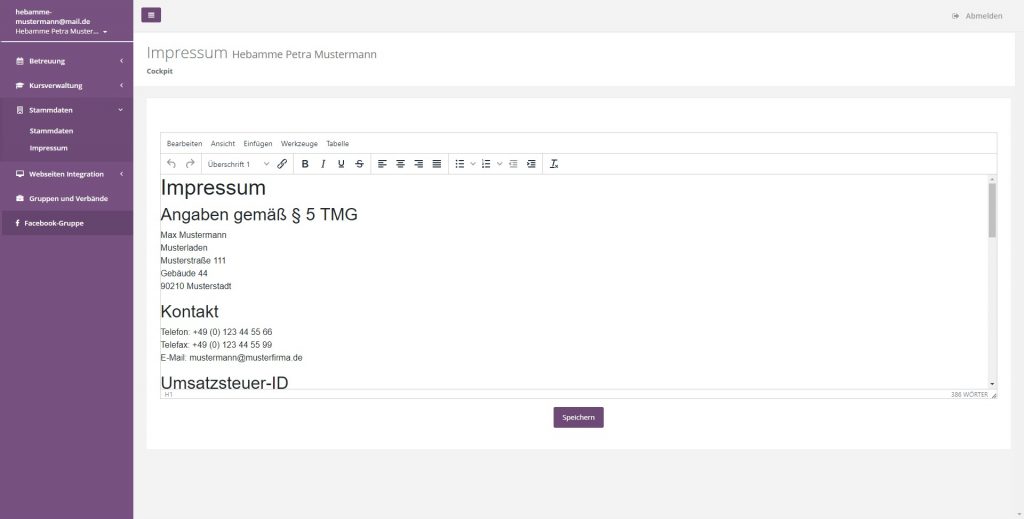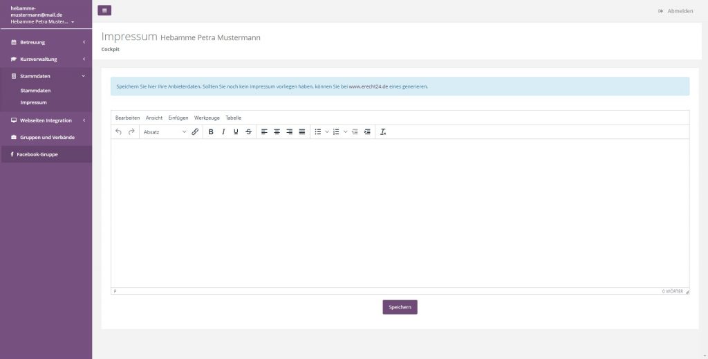Hier fügen Sie nun Ihr Impressum ein. Sollten Sie kein Impressum haben, können Sie z.B. über den Generator von erecht24.de ein Impressum generieren.