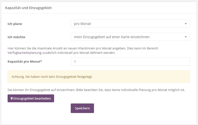 Eine Kapazität entspricht einer betreuten Frau. Die Planung pro Woche hat den Vorteil, dass die errechneten Termine über den Monat verteilt sind. Die hier hinterlegten Werte sind nur die Standardeinstellung. Sie können individuell Wochen- oder Monatsweise die Kapazitäten erhöhen oder verringern. Außerdem können Sie Abwesenheiten planen.