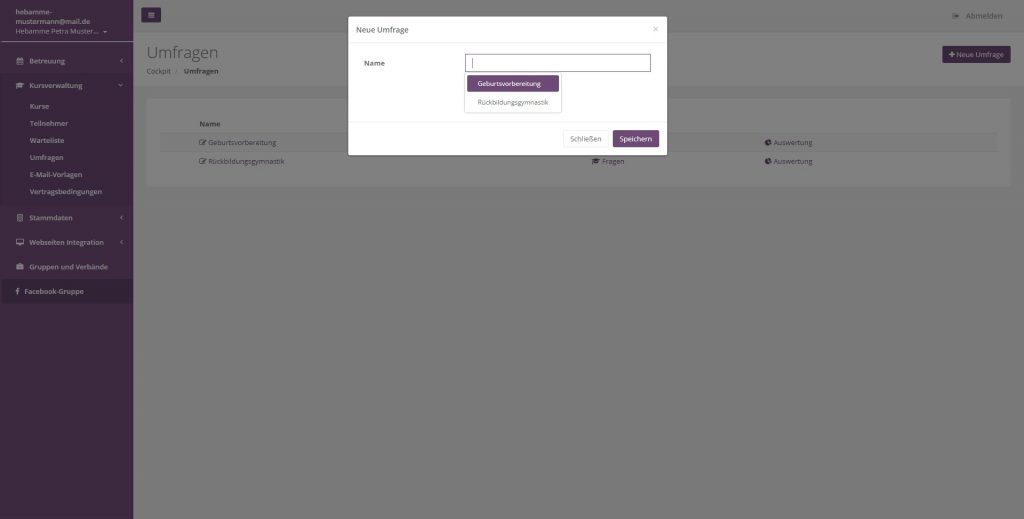 Navigieren Sie auf Kursverwaltung ⇾ Umfragen und klicken oben auf neue Umfrage.