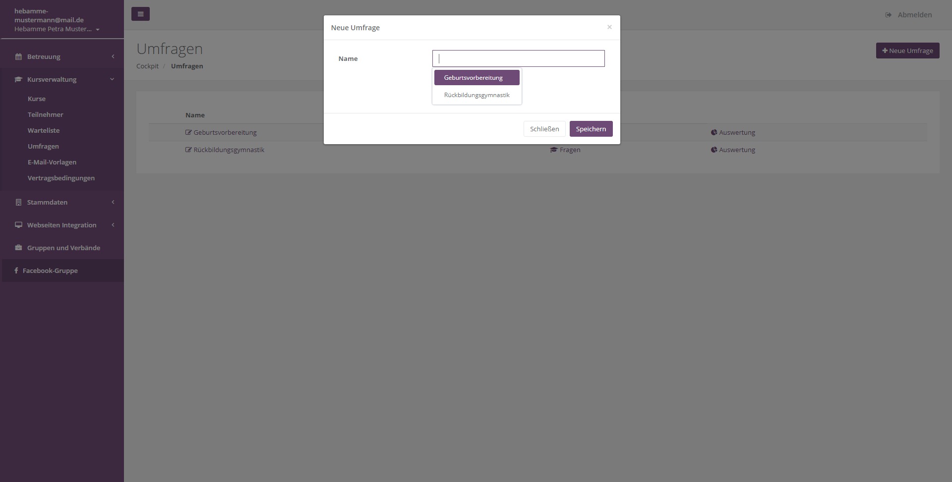 Klicken Sie in das Feld Name und wählen Sie entweder Rückbildungsgymnastik oder Geburtsvorbereitung aus anschließend aktivieren Sie den Haken Vorlage kopieren und klicken auf Speichern.