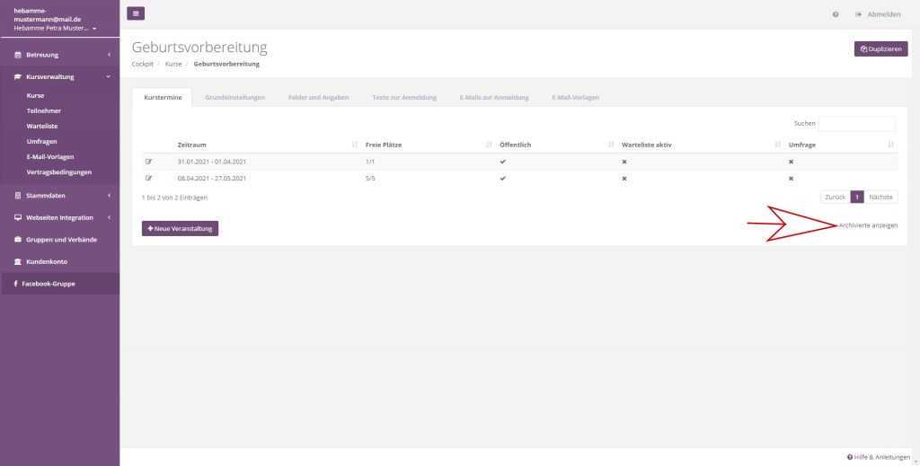 Die archivierten Veranstaltungen können Sie einsehen in dem Sie in der Liste der Veranstaltungen auf Archivierte anzeigen klicken.