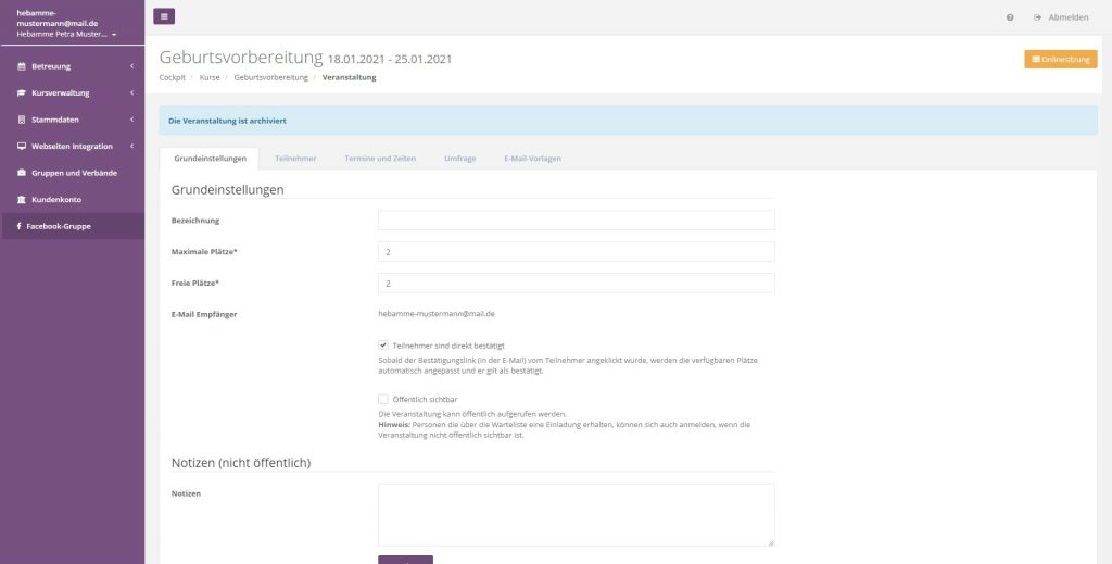 Die Veranstaltung wird in den meisten Listen verborgen. Alle Daten auf der Warteliste und alle nicht bestätigten Teilnehmer werden gelöscht.