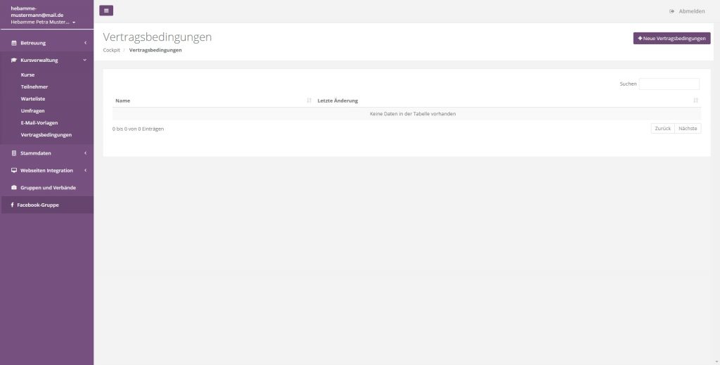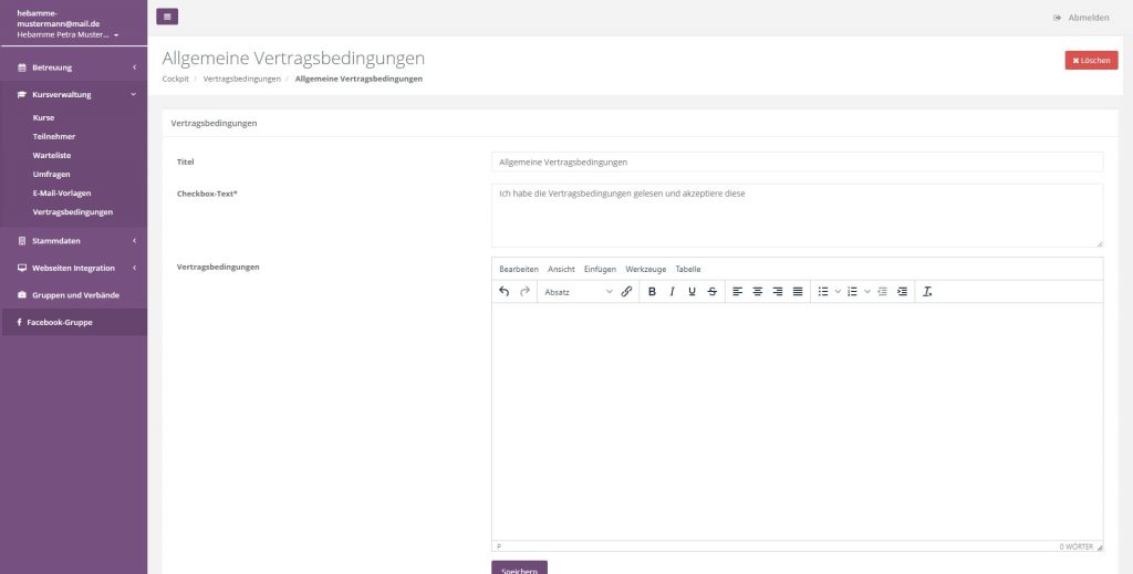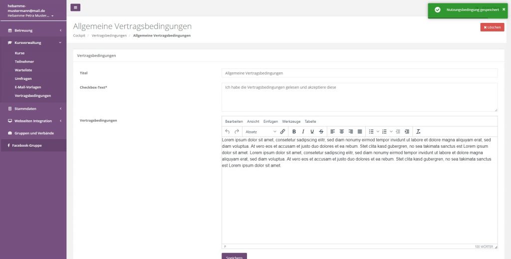 Sie haben die Möglichkeit im System unterschiedliche Vertragsbedingungen zu hinterlegen. Diese werden von den Teilnehmern des Kurses akzeptiert. Sie können beliebig viele Vertragsbedingungen hinterlegen und so für unterschiedliche Kurse unterschiedliche vertragliche Grundlagen setzen.