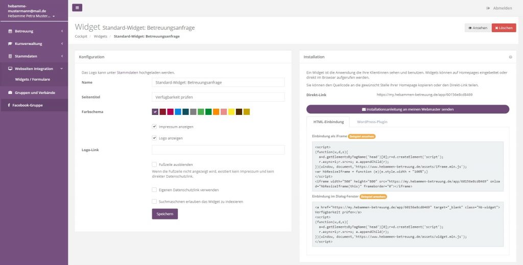 Hier finden Sie den Quell-Text zur Einbindung in Ihre Webseite bzw. das WordPress-Plugin, falls Sie eine WordPress-Homepage haben. Außerdem können Sie die Installationsanleitung an Ihren Webmaster senden.
