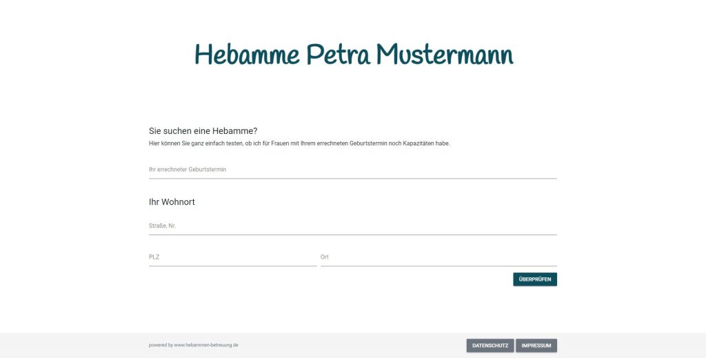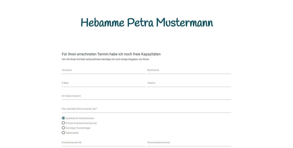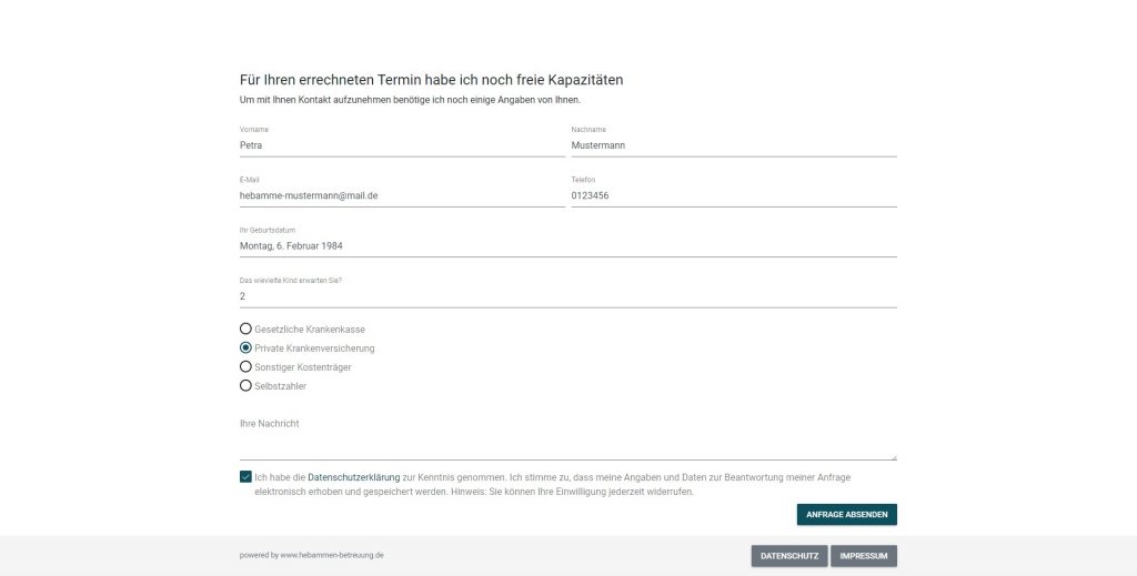 Die Schwangere gibt auf Ihrer Homepage nun ihren errechneten Termin und ihre Anschrift ein. Sollten Sie noch freie Kapazität haben und die Schwangere wohnt in Ihrem Einzugsgebiet, dann ist eine Anfrage möglich und Sie erhalten alle relevanten Daten per E-Mail.