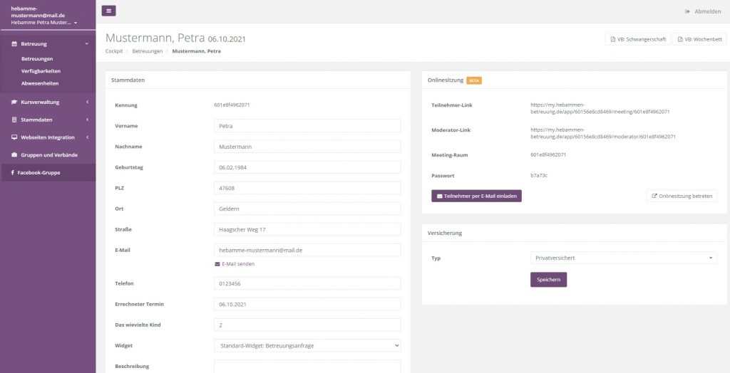 Sie, als Hebamme, erhalten alle Angaben per E-Mail. Ergänzend werden die Daten im System erfasst.