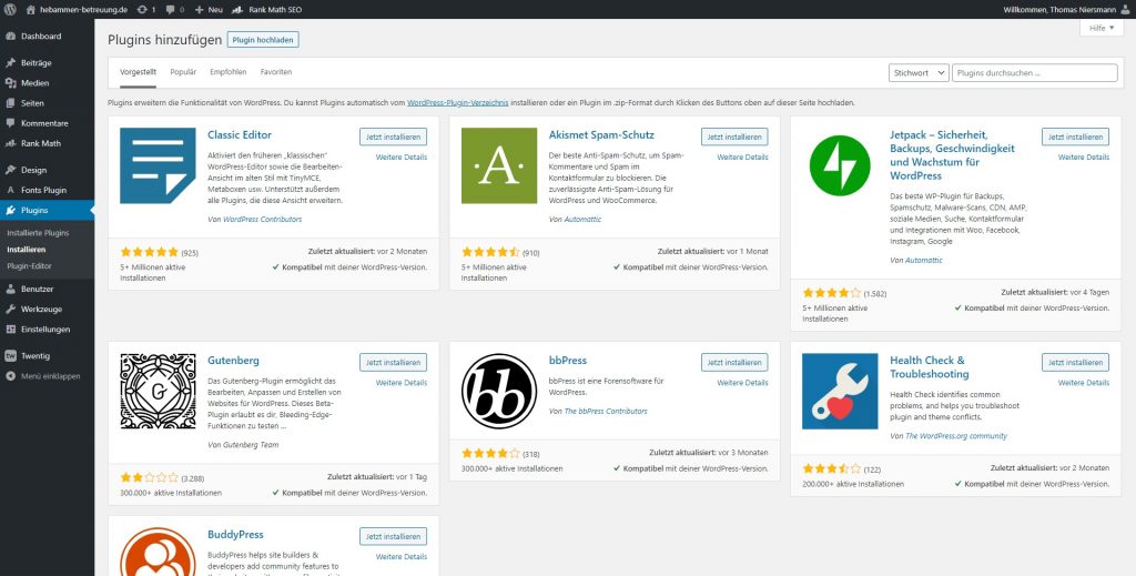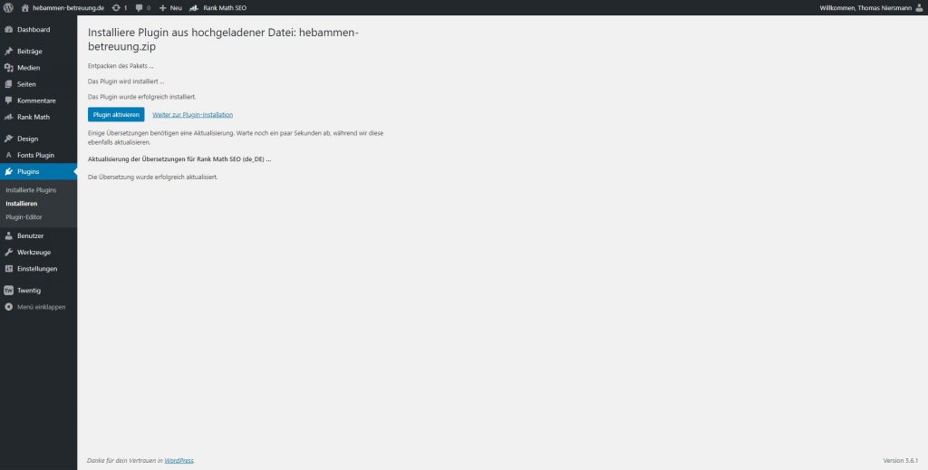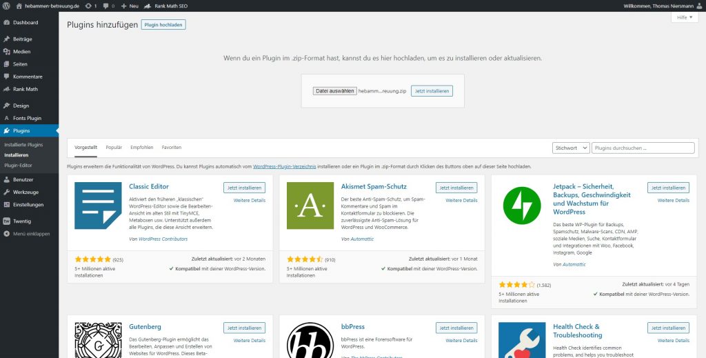 Nun klicken Sie oben auf den Button Plugin hochladen und wählen die Datei hebammen-betreuung.zip aus, diese eben heruntergeladen haben.